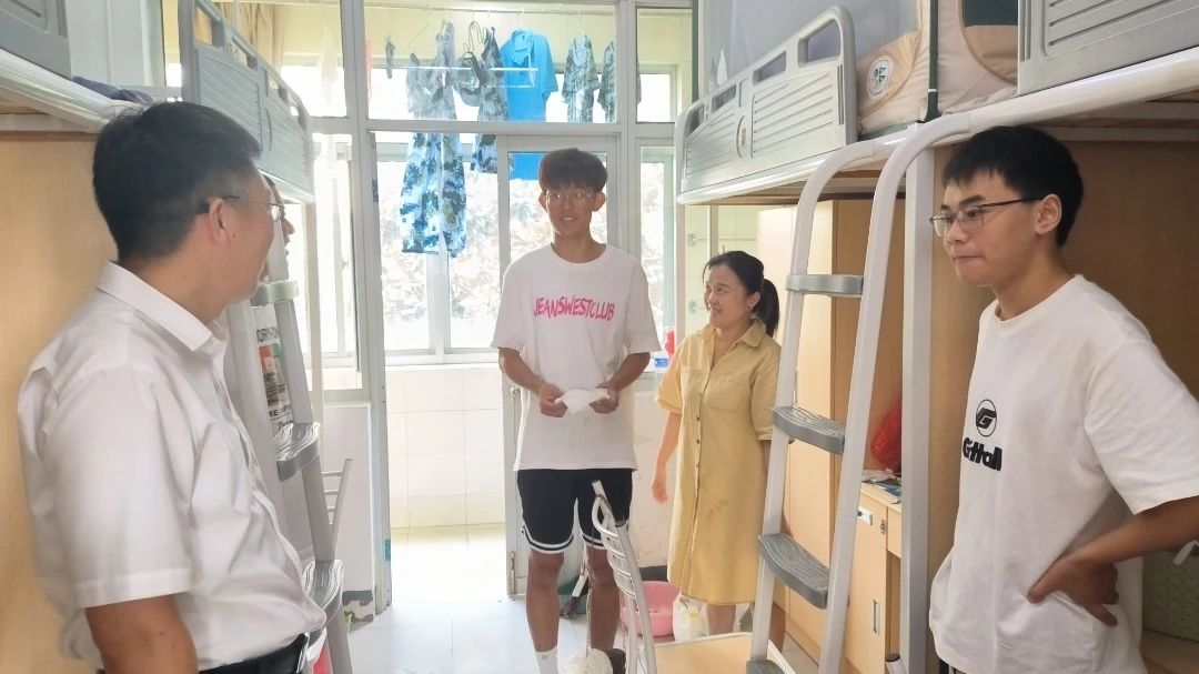 学院党委书记陈伟刚,院长赵永好,副院长宋丹,副书记、副院长辛绍权与新生辅导员温泽来到宿舍看望新生,与新同学和家长们亲切交流,询问他们对av影片 的第一印象和学习生活感受。