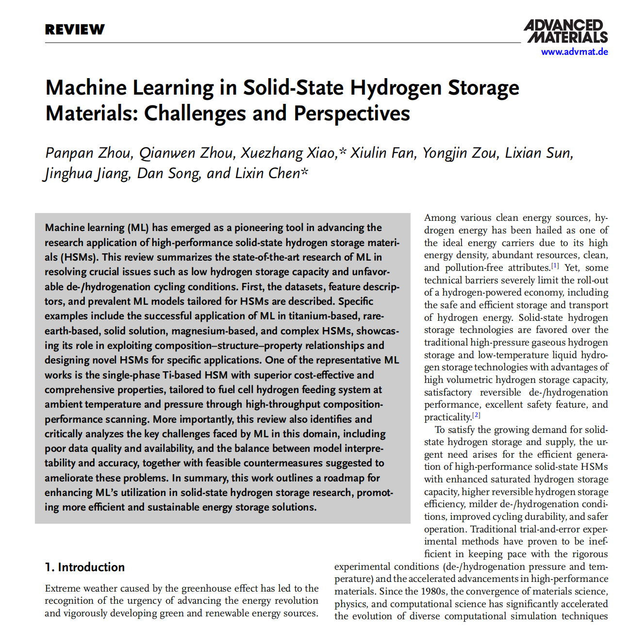 青年教师周盼盼以第一作者身份在材料领域顶级期刊《Advanced Materials》上发表了题为“Machine Learning in Solid-State Hydrogen Storage Materials: Challenges and Perspectives”的综述长文(非邀稿),av影片
