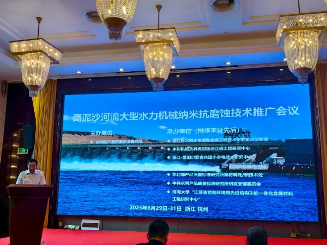 2025年8月29日- 30日,由水利部产品质量标准研究所主办的“高泥沙河流大型水力机械纳米抗磨蚀技术推广会议”在浙江杭州举行,av影片 “江苏省苛刻环境用先进结构功能一体化金属材料工程研究中心”与浙江省水利水电装备表面工程技术研究重点实验室等多家单位联合承办。