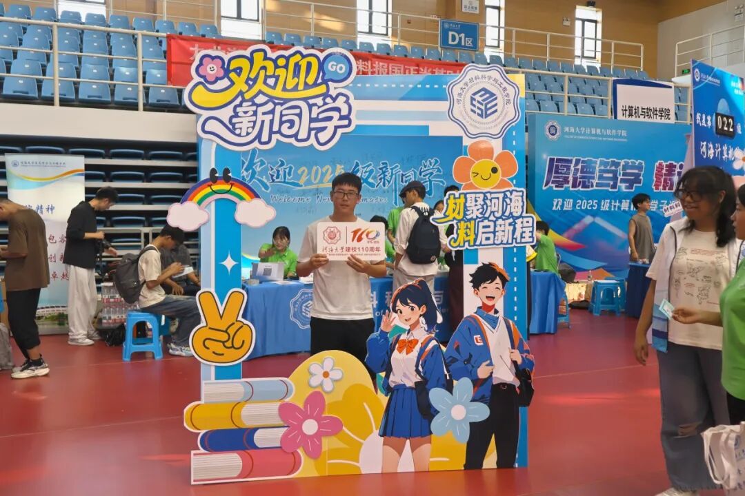 许多新生在特色展板前合影留念,并在背景墙上写下自己的名字,开启四年的大学时光,他们承载着青春的梦想,即将在河海av影片 这片沃土上生根发芽。